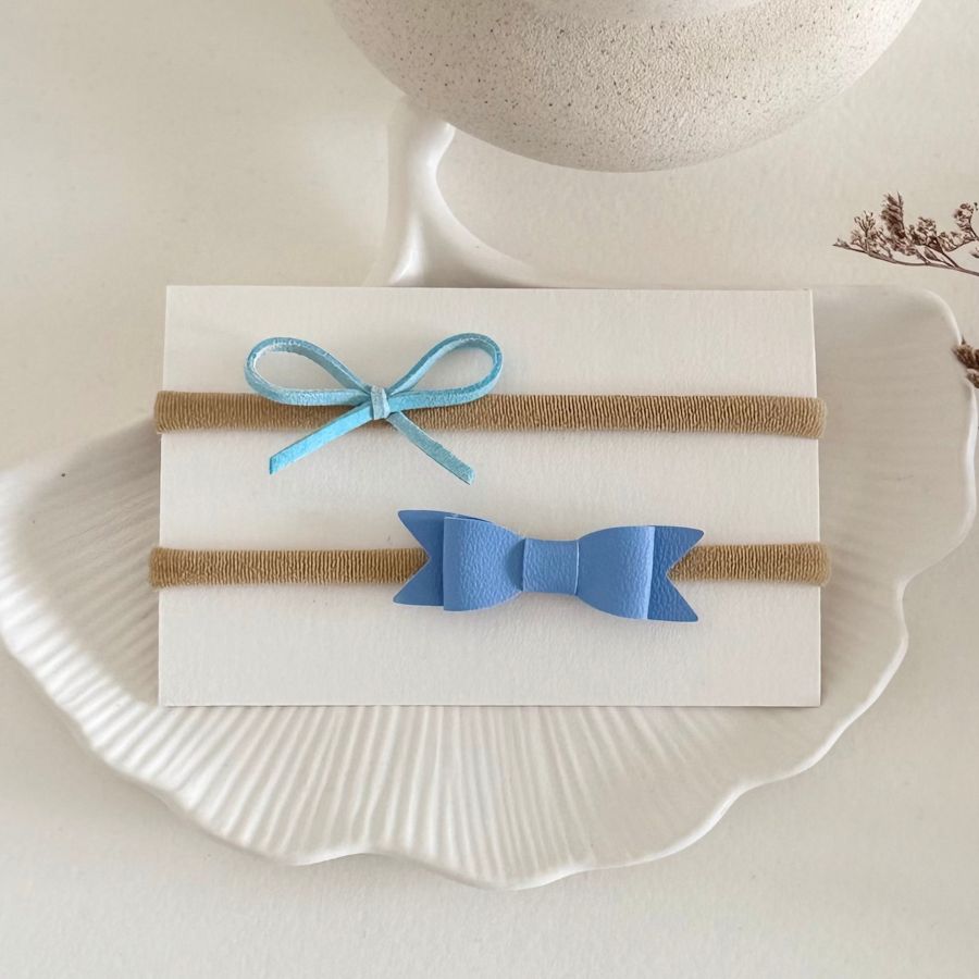Komplet dveh naglavnih trakcev z minimalističnima pentljicama v modrih odtenkih.