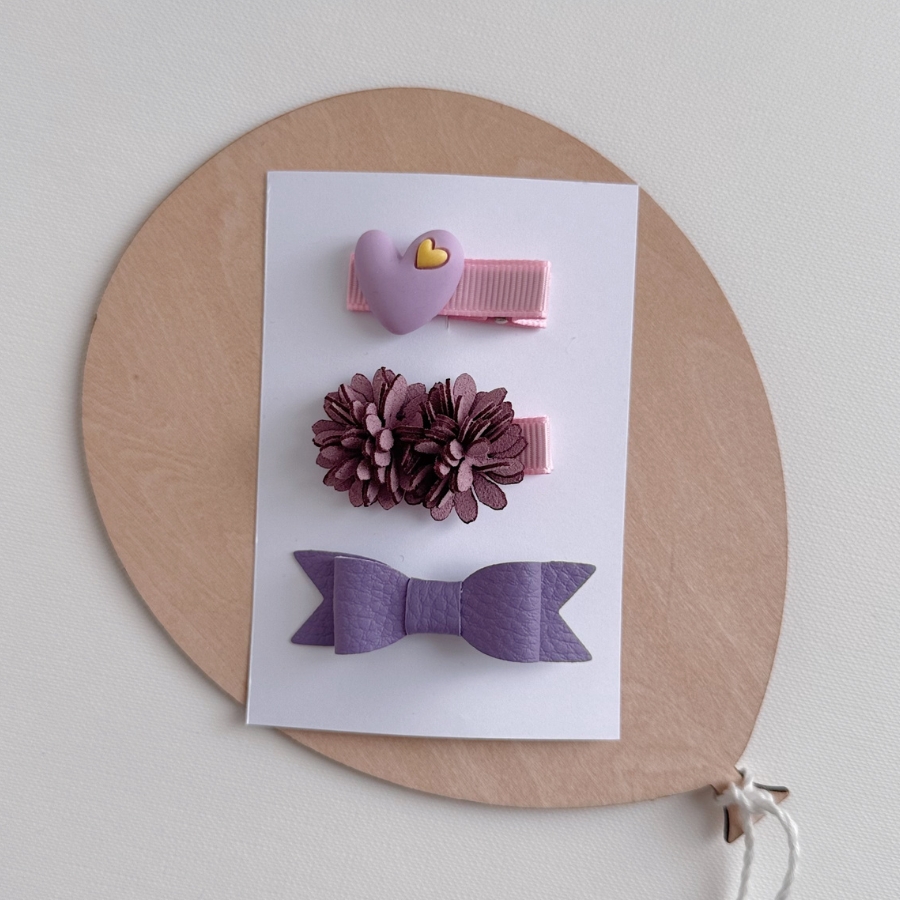 Komplet treh mini špangic za prve laske v pastelno vijola odtenkih.